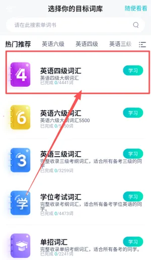 2、登录后选择你的目标词库,可以在热门推荐里找到英语四级六级等词书,点击学习按钮即可开始设定计划。