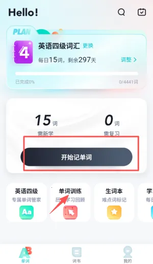 3、进入学习界面能看到计划进度和每日任务,点击开始记单词按钮即可进行新词学习和复习,还能使用生词本标记难点。