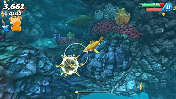 3、接着通过触屏操作来控制鲨鱼去吞噬各种小鱼。