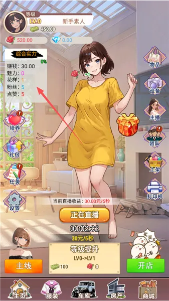 1、玩家在游戏中将化身女主播,个人魅力和花样越多,粉丝和点赞数量越高