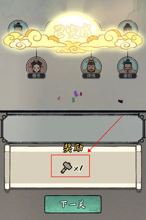 5、所有圆框正确填入就可以通关并获得锤子奖励啦。
